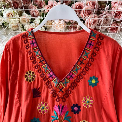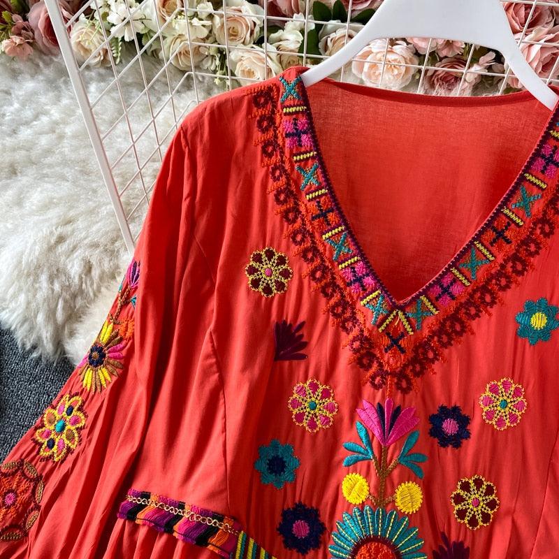 Flowing dress with floral embroidery design. Available in blue, red, white or yellow.